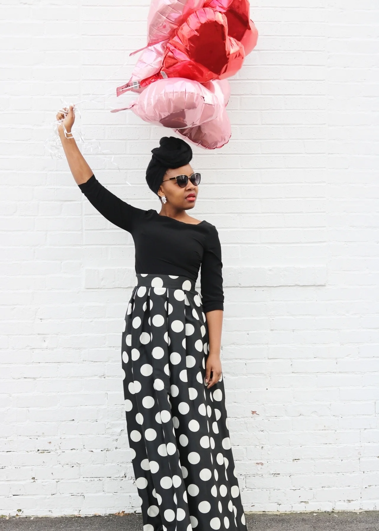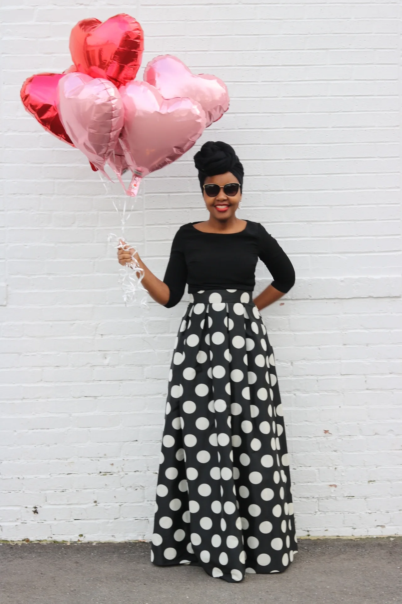 This look is effortless and conservative chic! I remember being in Abu Dhabi a couple years ago in (what was perceived as) booty shorts and feeling out of place with the locals. I was like I wonder if I can throw a totes conservative look together for my modest wearers and still look & feel my best! I love this polka dot maxi satin skirt I purchased from Nordies! Check the links below because I found a dupe for under $40. The top is actually an old dress that I got several years ago from Old Navy. I have upped this 'could be basic' look with a bold red ombre lippie, statement earrings, and metal detail sunnies! And just in case you are underwhelmed, the balloons are for you! Love you all and thank you for your support! Until next time...
