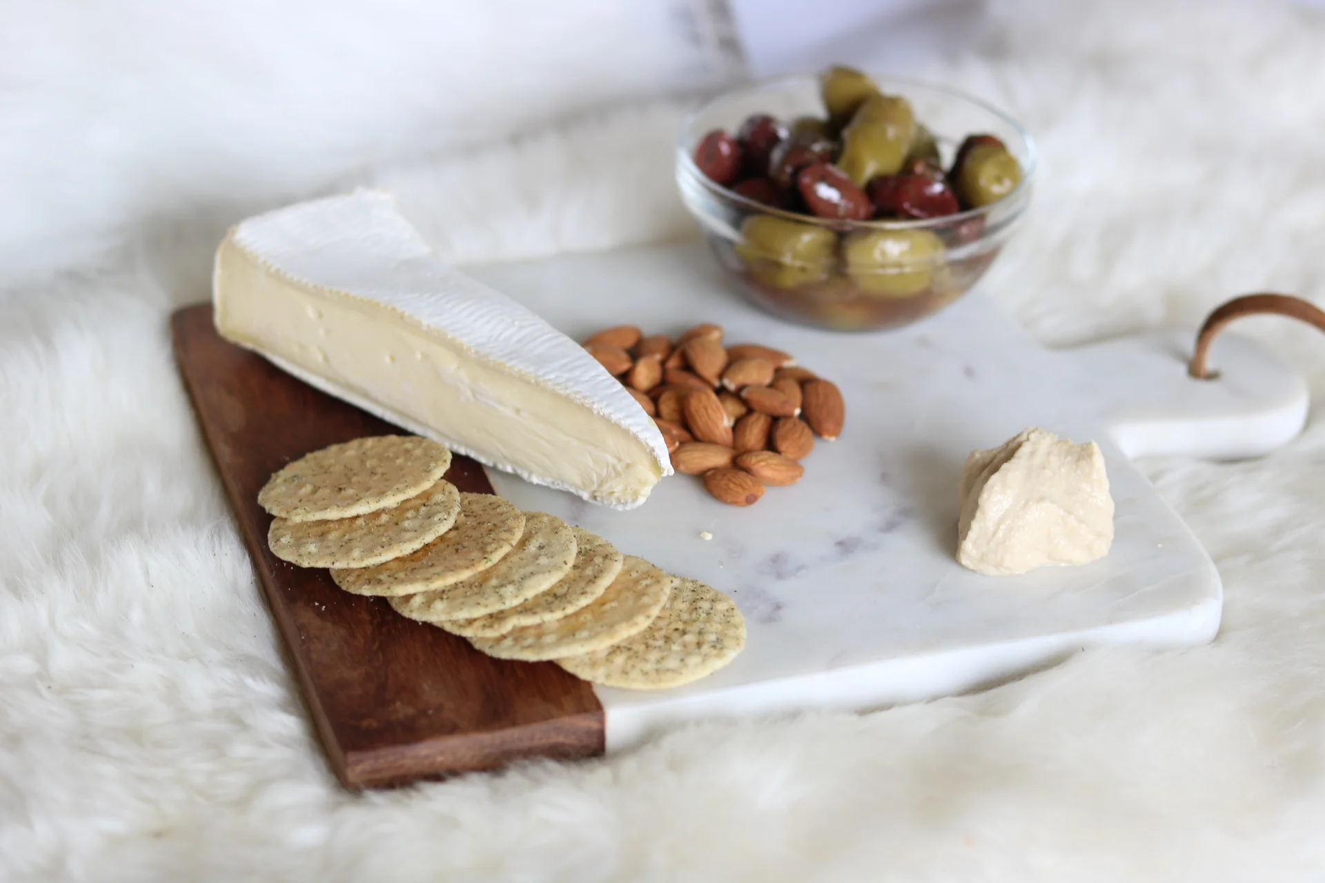 1. Did someone say Charcuterie? Set a delicious spread for yourself with simple ingredients: hummus, crackers, raw nuts, Brie, Mediterranean olives (you can add cured meats, fruit, various cheeses etc)