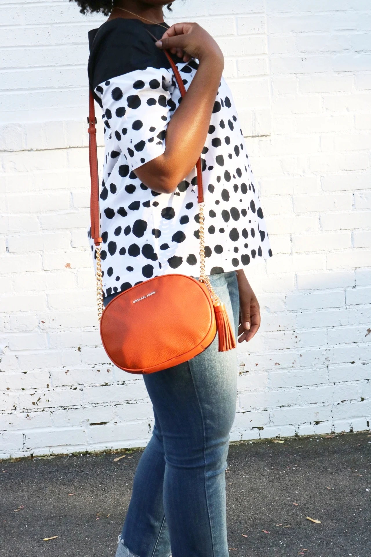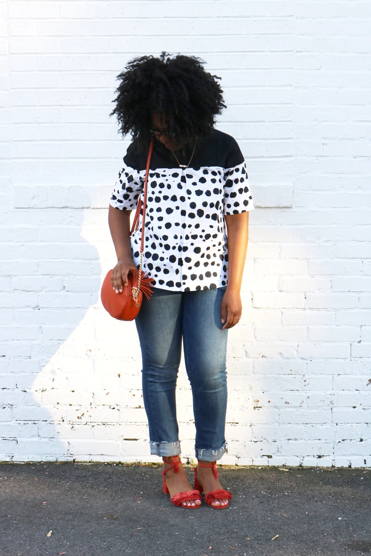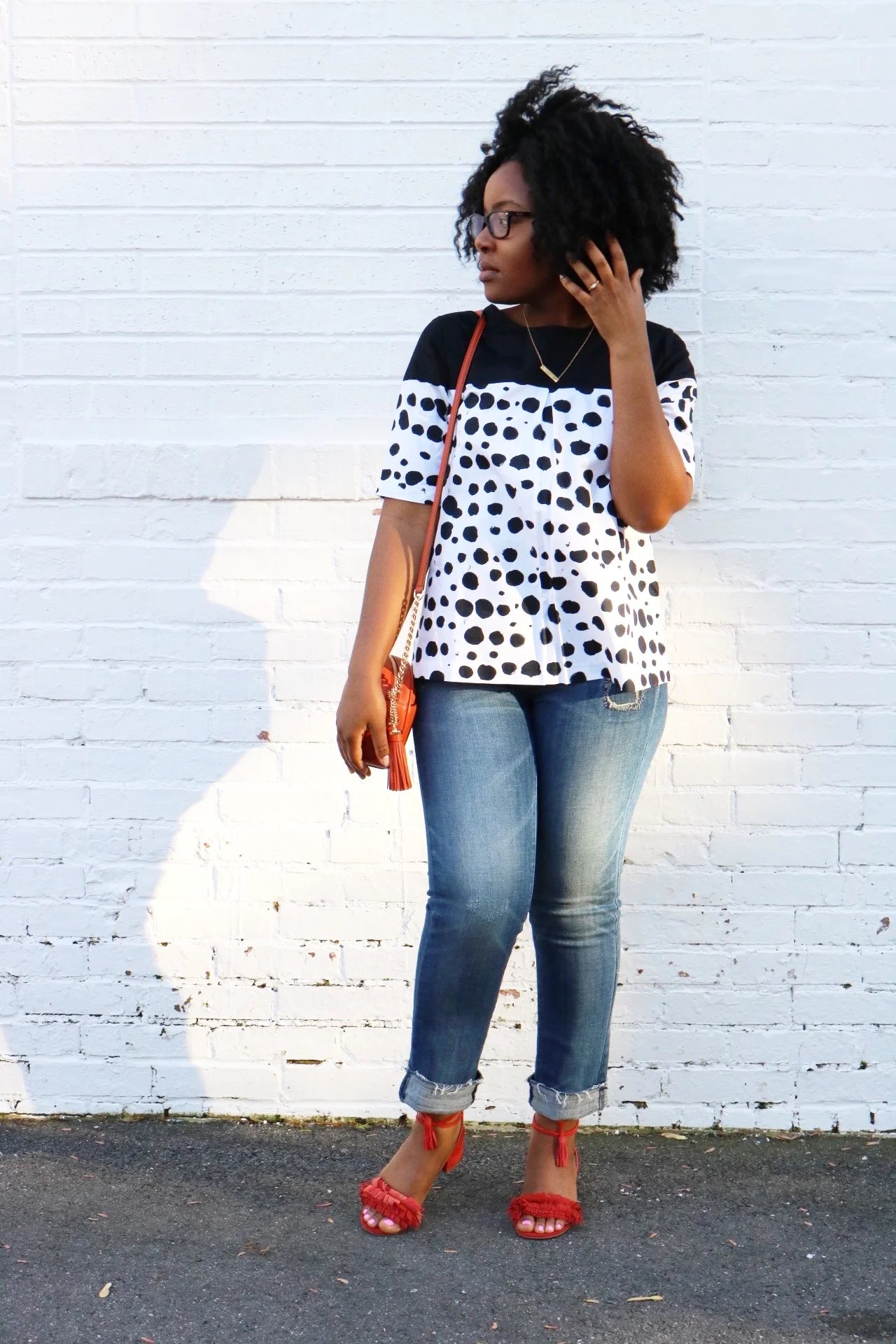 This look was totally inspired by this gorgeous top by CHICasual out of New York. I am totally inspired by innovative minds who develop small businesses and I am always out to support. These gorgeous shoes are courtesy of sole society and are just on trend with the fringe and chunky heel. In typical Nonee fashion, I had to pair this outfit with a fun purse that happened to match perfectly with my shoes!