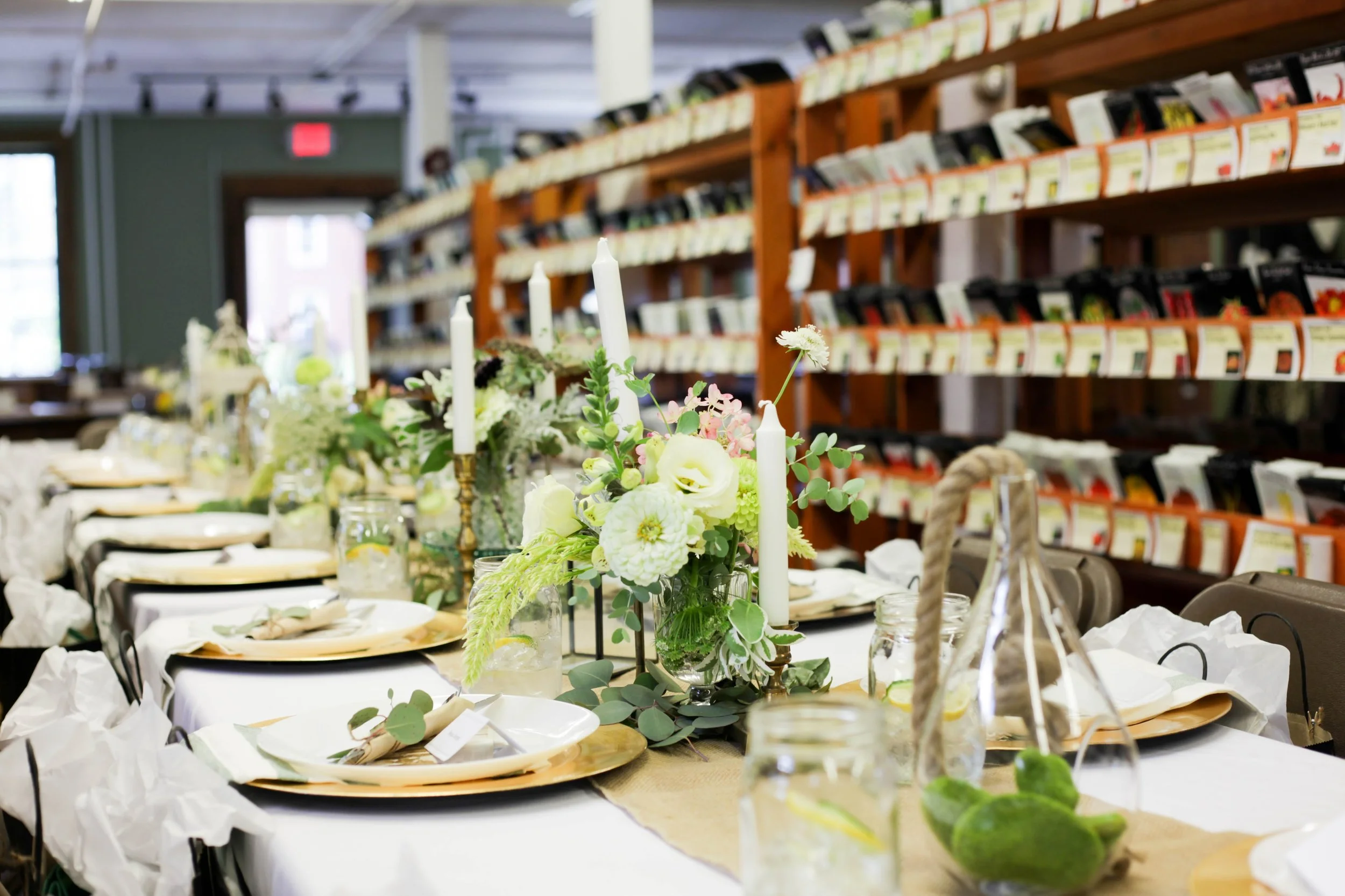 Up until a day before the event, I had an idea for the table setting but was not 100% sure. Thankfully, Eddy Farms sponsored the floral centerpieces so I just touched base with Haley from there to find out what colors she was thinking of incorporating into the florals. After settling on lots of greenery with white and pops of subtle colors, I opted to play on the greenery/rustic farmhouse theme. I ordered white floor length table cloth, burlap runners, and gold/champagne/copper chargers. I have been collecting brass candlesticks for my wedding so I put those to good use for this event. I had a few glass ornamental vases that I threw into the mix. I also made a necessary stop at Ikea. There, I picked up several green/white dish towels to use as napkins, candlesticks, plates, and a few other loose ends. I knew I could gather some fun items at home to fill in here and there so I was not too worried. Overall, it was an elegant table scape. The florals tied in beautifully with the rest of the decor.