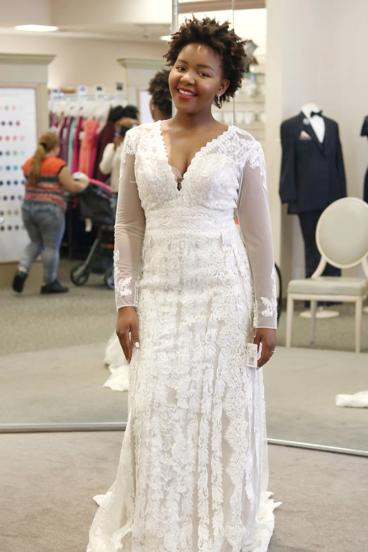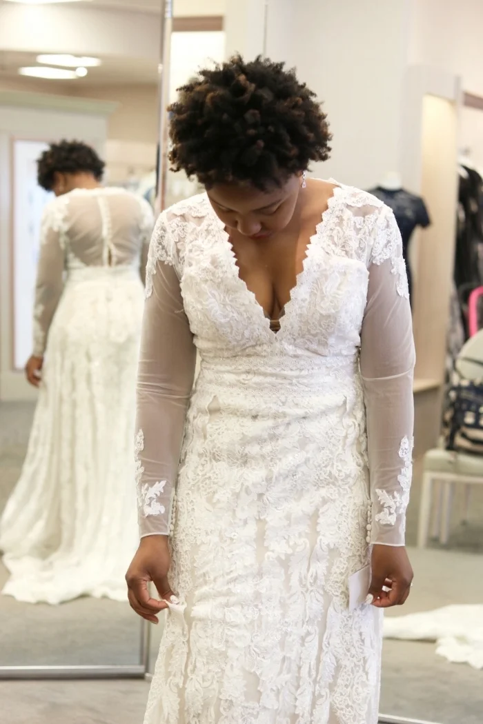 After going over my vision and goals, my stylist took all that and funneled into a plan for my appointment. She set out to try on a maximum of five dresses which was beyond reasonable. At the time of my appointment, I was her only client. We went rack to rack, dress to dress searching for the perfect dresses to try on. My job was to simply pick out dresses, and she would gather them together and get a room started for me. After we picked out the five dresses, we went over a game plan of how we would get these dresses on and off! Seriously guys, it is a task depending on the dress! Most dresses are not a simple slide in and out type of situation. There were many times I would step into a dress and yell help and my stylist would be right there to zip me up or button me up. They truly have your undivided attention for the time you are there (which was about two hours). The funny thing is, there are no mirrors inside the dressing rooms, only on the outside which was fun and interesting for me because it like promotes community involvement! You can't put a dress on and see yourself and bail on it before anyone else sees it.