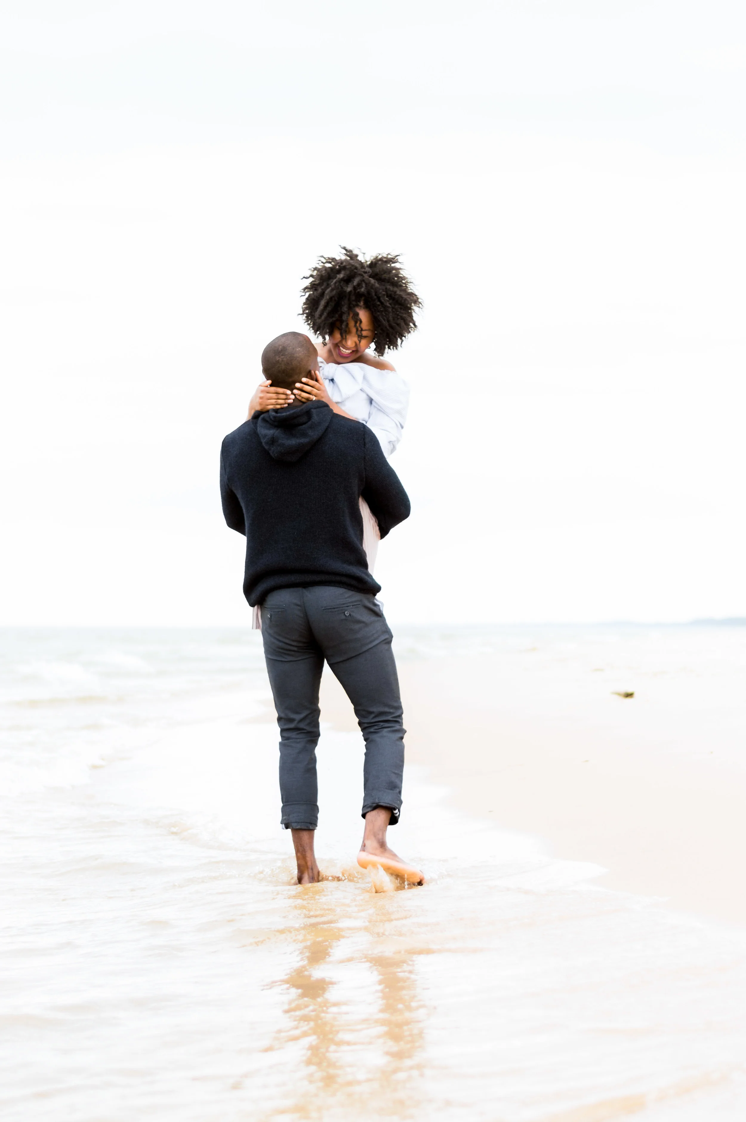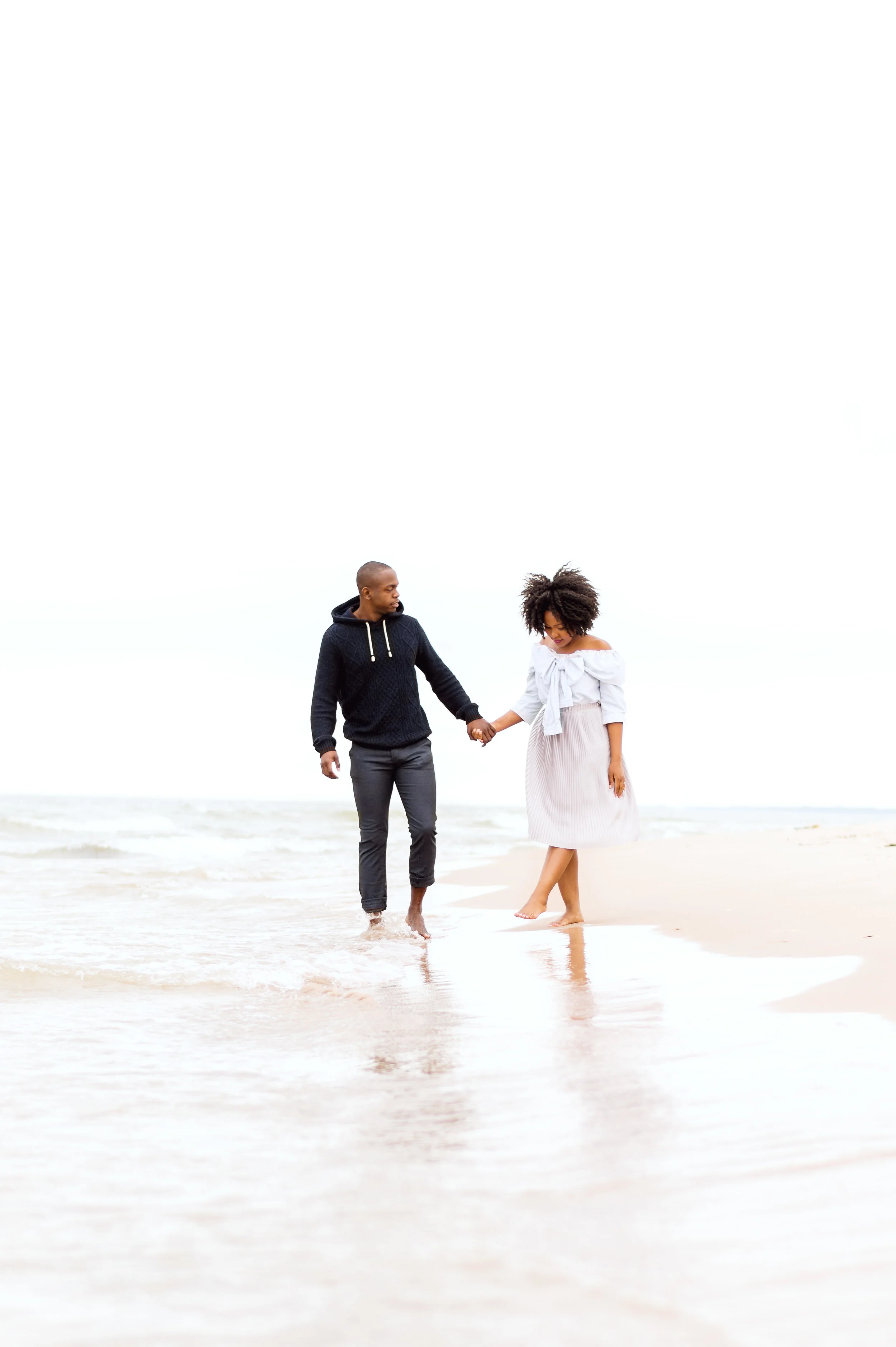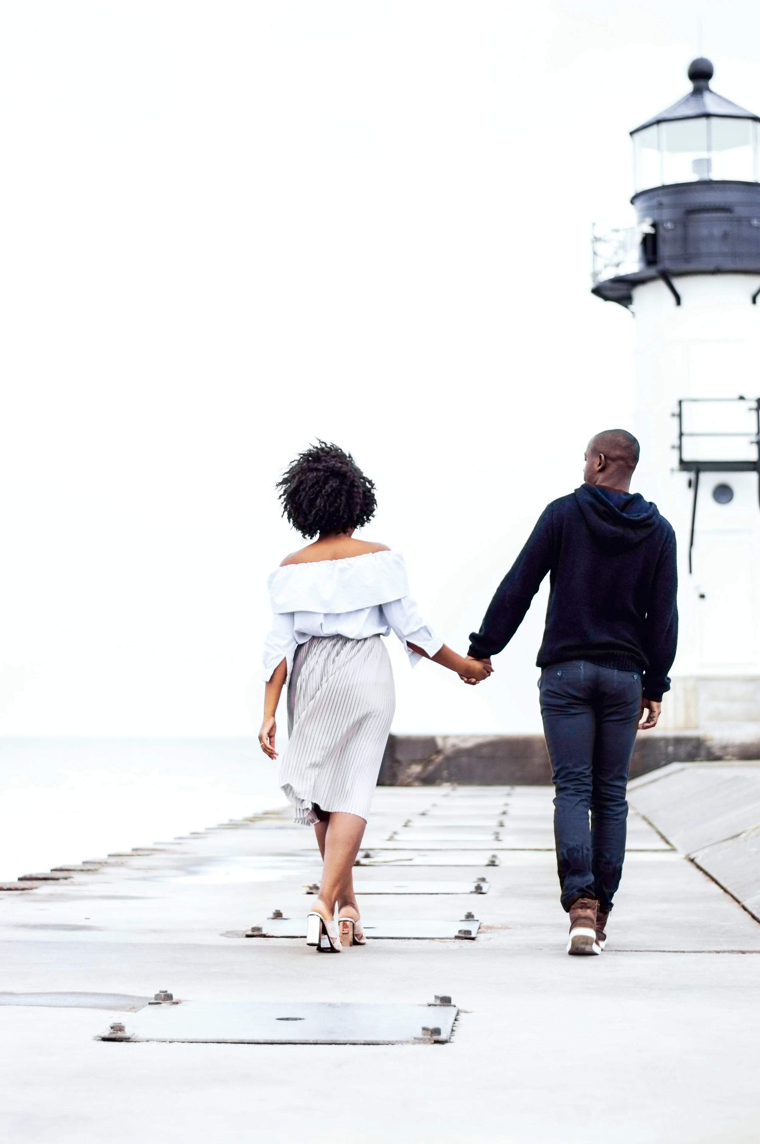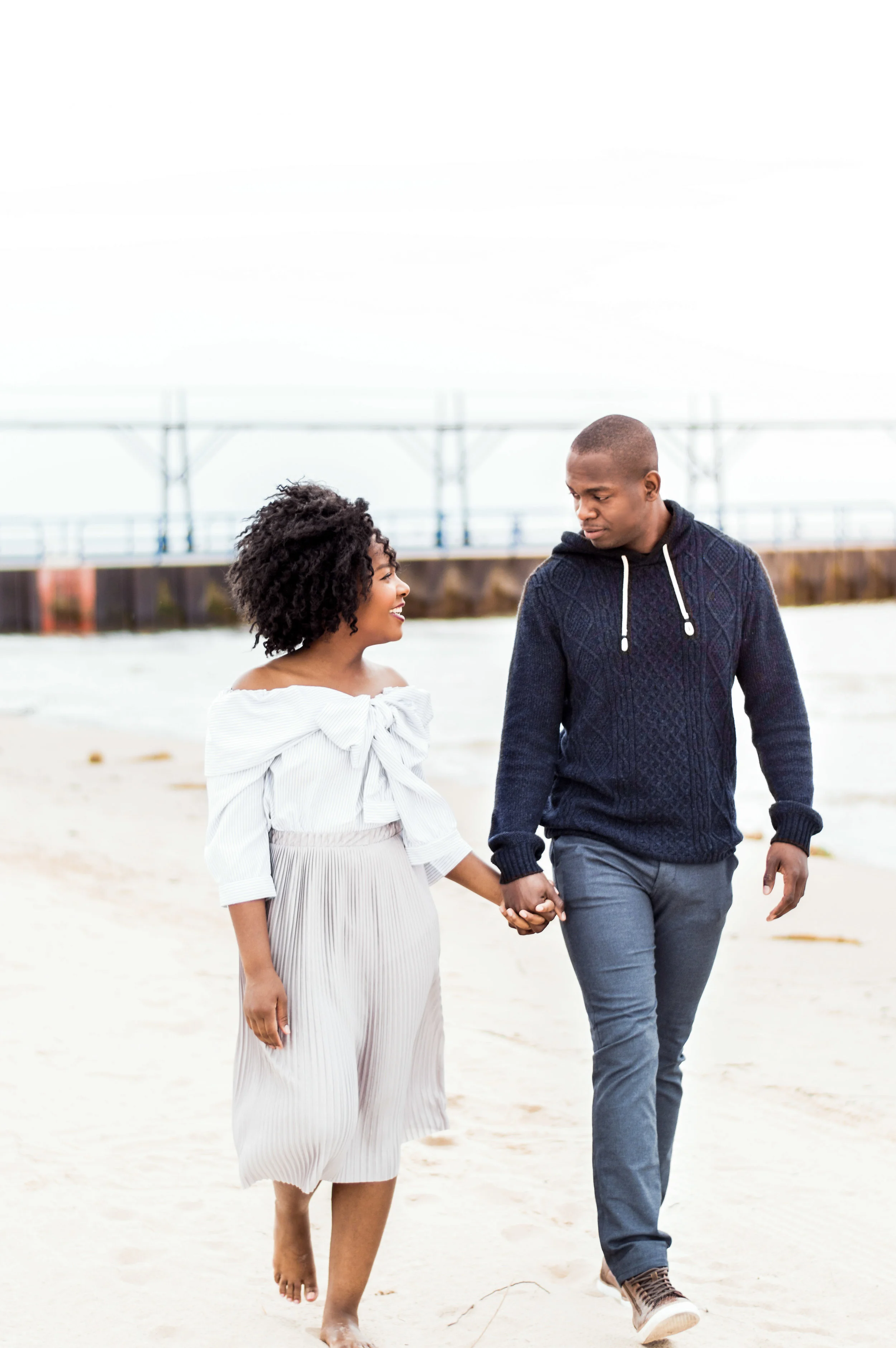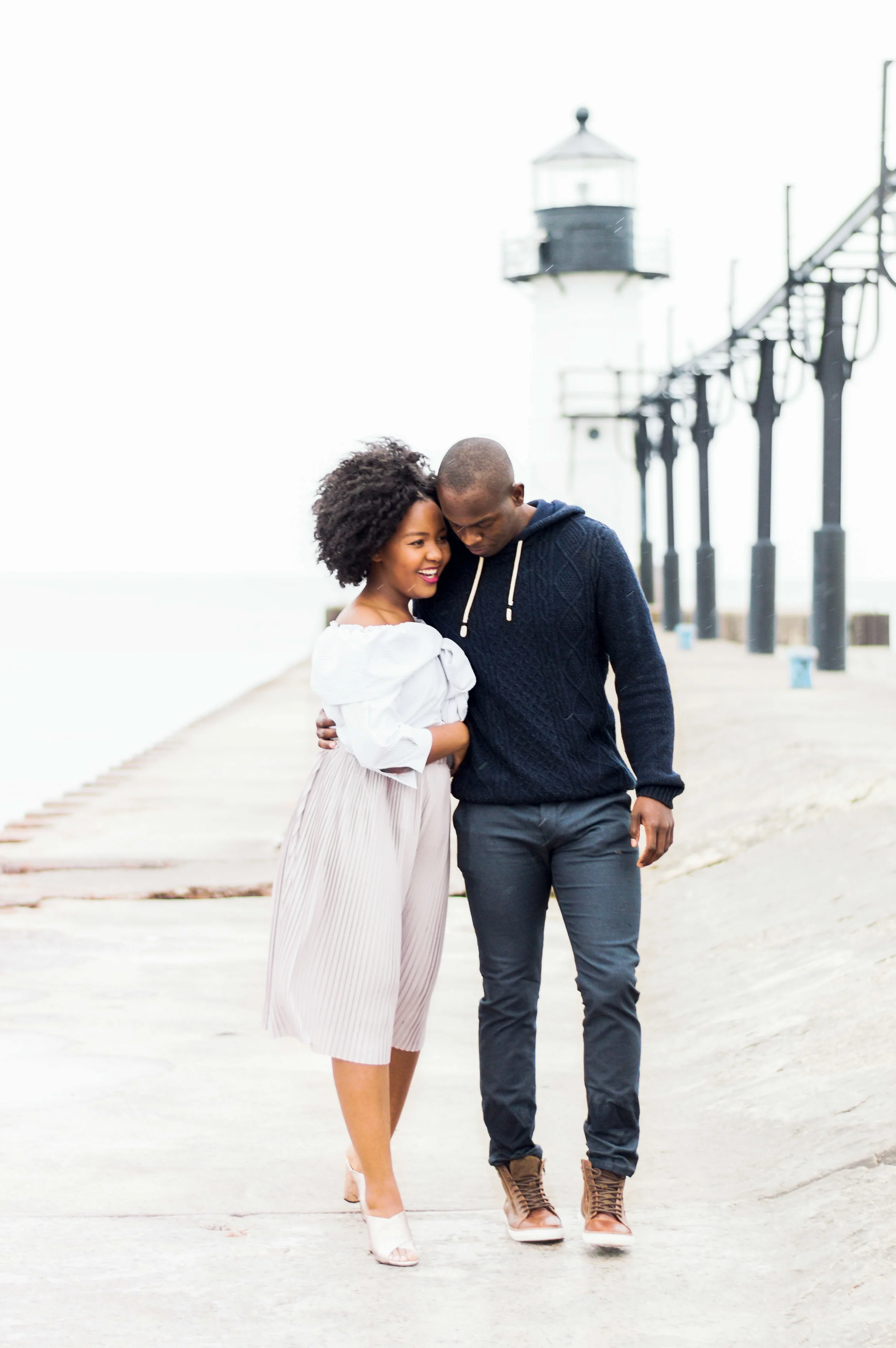 Taj and I are so atypical in the most typical way possible. He is my closest and sweetest friend who just happens to also want to hang out with me for life. The idea of having a life partner honestly, is magical and elfin' scary. I boast that I am an introverted extrovert and I love me time, all the time. So although I am happy yet scared but also super naive about what this next chapter will bring, I love this human and I am so excited to go on this epic adventure together. On this day, Taj and I drove to Saint Joseph, MI after spending two days in Chicago. In classic us, we were so late because of me and my lack of planning. Actually, we wanted to have at least a couple hours of free time before we went for this engagement session, but we were barely going to make it on time. This was troublesome because Taj had no 'nice' clothes to wear and I had purchased a beautiful white gown from H&M to pair with a paisley suit Taj would wear. Unfortunately, we had to regroup on the way, me trying to beat my face to the God's in the car and Taj wondering how we were going to pull this off! Thankfully, I came up with a master plan, changed my outfit plans so that we would be even, and the rest was up to Valerie Sigamani and we can all agree, these pictures are MAGIC. Scroll down for more...