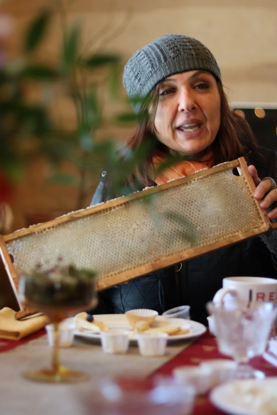 Our guided tasting began with a brief introduction on Marina's journey with bees and with details about the life of bees! Marina, a life long artist, purchased the land the Apiary sits on many years ago without a vision of bees ever becoming a key part of the vision. Many years later, a neighbor invited her over to taste fresh honey from his beehive and following this interesting and eye opening encounter, Marina began her quest to be a beekeeper; all which has led her to were she is today. Fast forward to 2018; two books, a thriving Italian bee colony, blossoming honey and honey skin care products, and the Red Bee brand, it is fair to say that she is building a bee empire in the Nutmeg state!